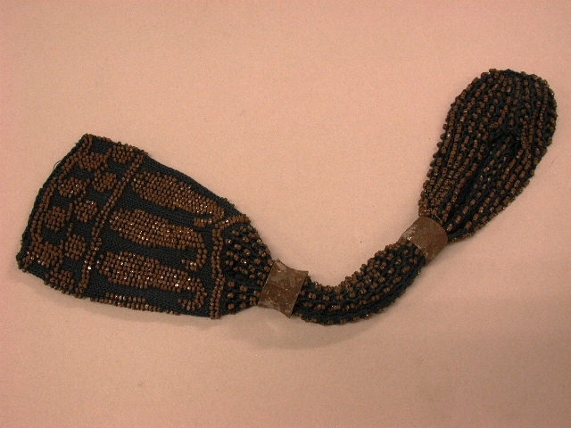 - BeschrijvingGebreid donkerblauw beursje. Versierd met meegebreide metalen kraaltjes. Kraaltjes bedekt met zilverkleurig laagje. Patroon: rand met bloemrank, palmetten en stipjes. Om het beursje 2 zilverkleurige metalen ringen. In het midden van het beursje split in lengterichting.