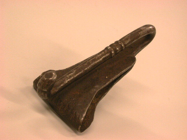 Metalen haak met dubbelgevouwen achterblad voor bevestiging aan rok.