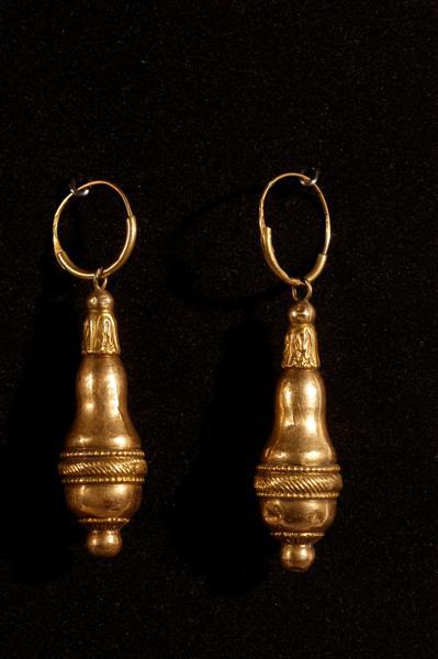 Oorbellen met reliƫfranden en knop aan het uiteinde.