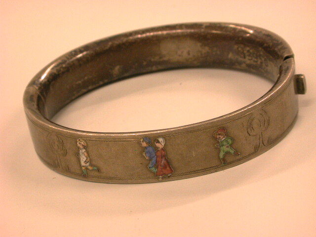 - BeschrijvingOvaal zilveren slavenbandje voor kinderen, bestaande uit 2 scharnierende helften. Sluiting met veer. Band versierd met gegraveerde randjes en 2 boompjes. Tussen de boompjes 4 lopende kinderen, in diverse kleuren, geƫmailleerd (?)