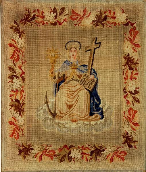 Borduurwerk in petit-point op borduurgaas met wollen en zijden borduurgaren. Uit lijst genomen.