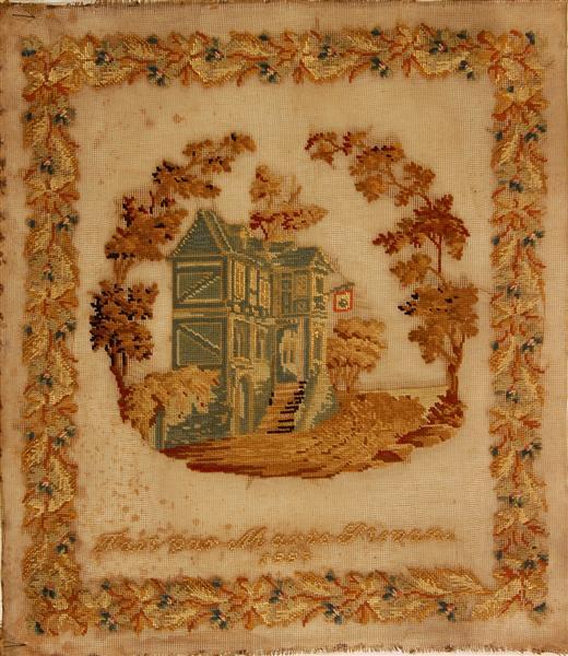 - BeschrijvingBorduurwerk in halve kruissteek op borduurgaas.Voorstelling: huis met uithangbord omringd door bomen