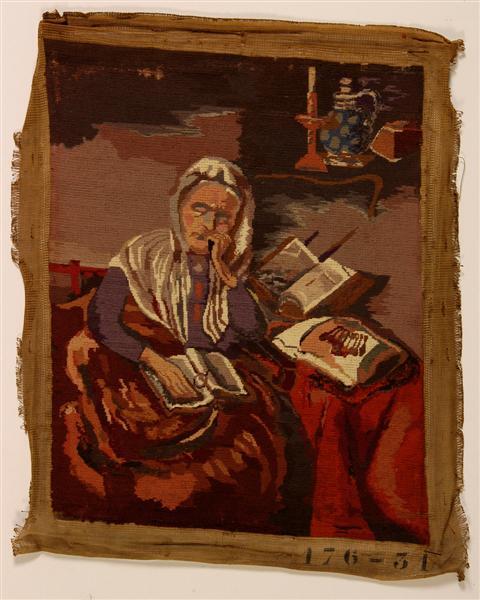 - BeschrijvingPetit point borduurwerk. Voorstelling van een ude vrouw met bril in de hand, boek op schoot. Naar het schilderij "Slapende oude vrouw"van Nicolaes Maes.