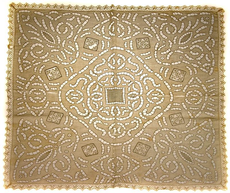 Vierkant wit linnen tafelkleedje met richelieuborduurwerk. Bloempatroon.