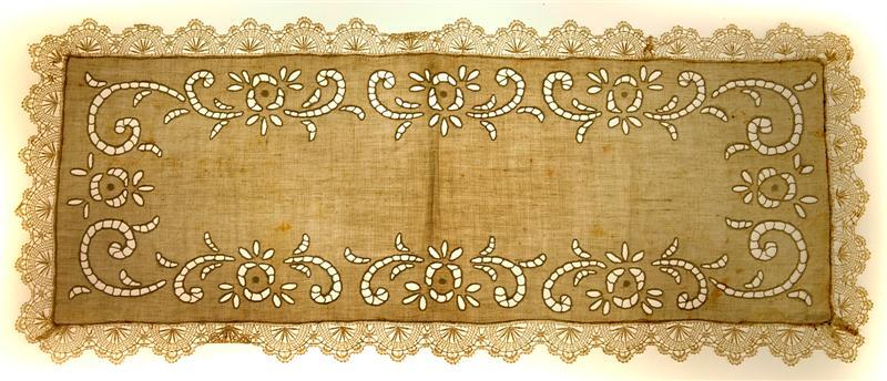 Rechthoekig kleedje van naturel kaaslinnen. Langs de randen een bloemmotief.
