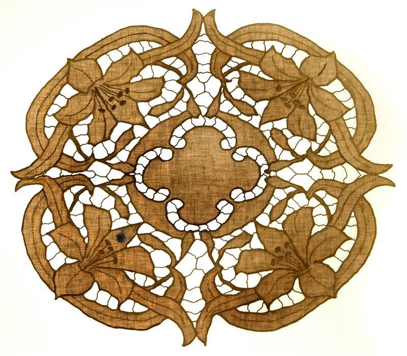 Linnen kleedje in richelieuborduurwerk. In het midden vier lelies op halve cirkels.