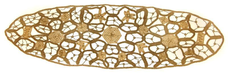 Ovaal kleedje van beige katoen, samengesteld uit geweven en gehaakt band en kantwerk.