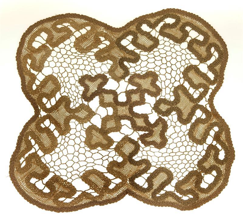 Katoenen kleedje met ronde hoeken en zijden. Samengesteld uit gehaakte band en naaldkant. Florale motieven.