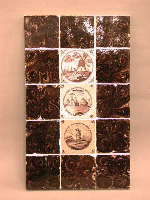 Tegeltableau van vijftien tegels waarvan drie met voorstelling in gips gevat. Van binnen naar buiten zijn te zien een molen op een dijk en drie zeilschepen aan de horizon, een hoeve aan het water en een bootje en een mansfiguur in een landschap met een stok.