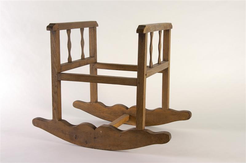 - BeschrijvingTwee gefiguurzaagde basisdelen met dwarslat en verbindend frame voorzien van gefiguurzaagde spijltjes: houtverbindingen De mand (wieg) ontbreekt.