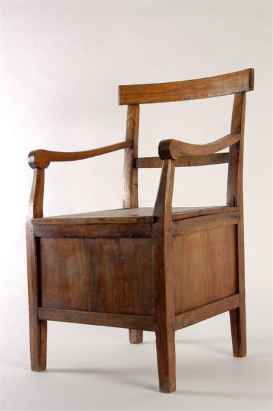 - BeschrijvingKamergemak in de vorm van een eenvoudige armstoel, waarbij onder de opklapbare zitting de bril te zien is. Aan de achterzijde van de stoel zit een scharnierend deurtje waarachter de po geplaatst kan worden