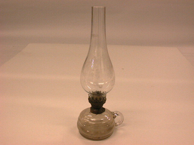 - BeschrijvingDriedelige petroleumlamp. Glazen reservoir voor petroleum met oor en kopvorm lonthouder, waarop glazen trekglas (flesvormig).