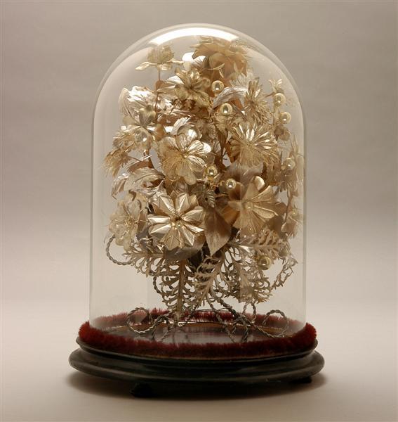 Ronde bruidsstolp op drie pootjes met een boeket van zilveren en papieren bloemen.