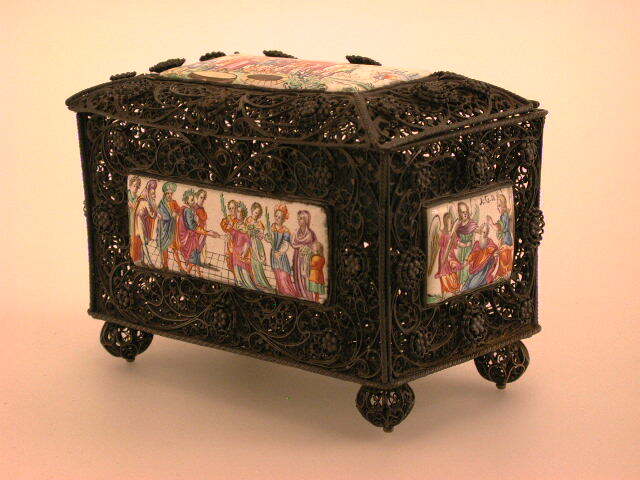 - BeschrijvingKnottekistje van zilver. Versierd in filigrain met vijf verschillende voorstellingen in emaille: Jozef verkocht naar Egypte; offer van Abraham; huwelijk van Abraham en Sara en nog twee onbekende voorstellingen.