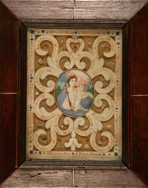 - BeschrijvingIngekleurde gravure van relikwietuintje met Maria en Kind. De gravure is omgeven door banderolles (knipselwerk).