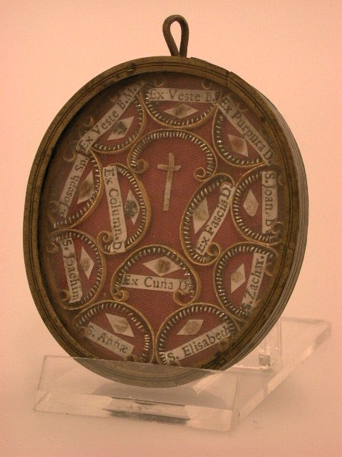 - BeschrijvingRelikwietuintje in koperen doosje, achter glas met lakzegel aan de keerzijde. 12 perkjes met relikwie. Goudpapier rollé en zilverdraad ter versiering. Een kruis op het midden, op rode stof. Het geheel bevestigd op papier met notenschrift aan keerzijde.