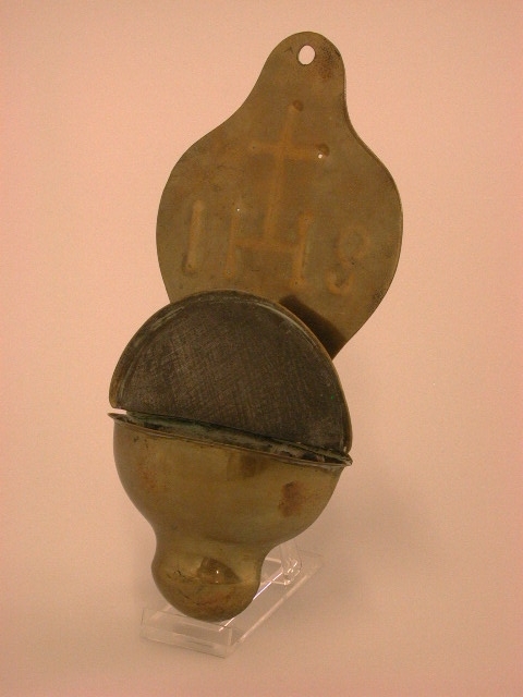 Wijwaterbakje. Wandplaat met 3 lobben waarin gedreven Christus monogram.