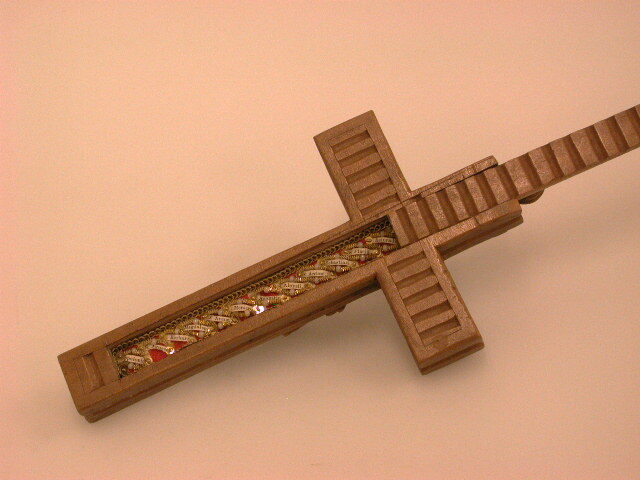 Kruis zonder voet met meegestoken corpus. Achterzijde: schuifje met 15 relikwieen van verschillende H.H.