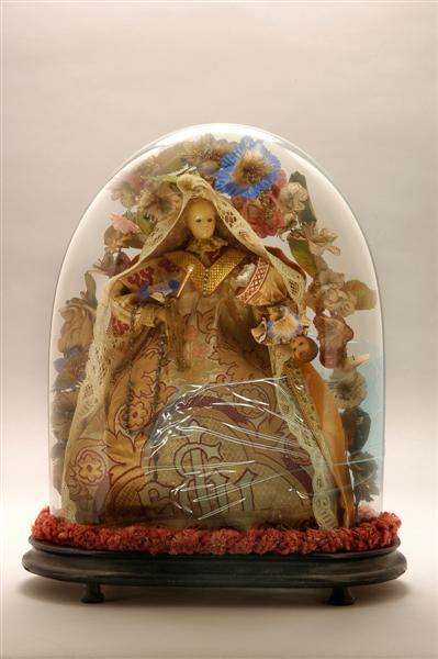 - BeschrijvingGlazen stolp met bloemenvaasje met Maria en kind in nis onder een bloemenboog. Rond op drie pootjes. Maria en kind van was, met kleding van zijde. Haar van Maria waarschijnlijk echt.
