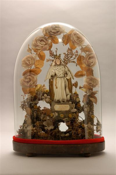 Een porseleinen beeldje van de Heilige Blanche van Castiliƫ in een glazen stolp. Beeldje gemaakt van zeer dun, wit materiaal, met mantel van ander materiaal. rots versierd met een herder, een huisje, de grot van Lourdes. Rots versierd met dieren en bloemen..