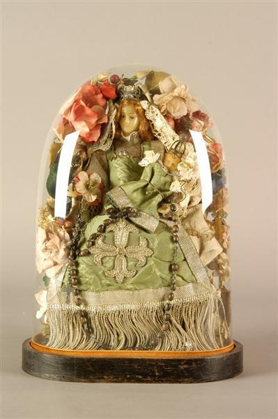 - BeschrijvingOvale glazen stolp op zwartgelakte houten met Mariabeeldje met kind onder een boog bloemen. Om de stolp een lichtbruine fluwelen bandje.