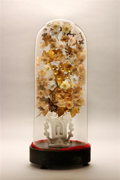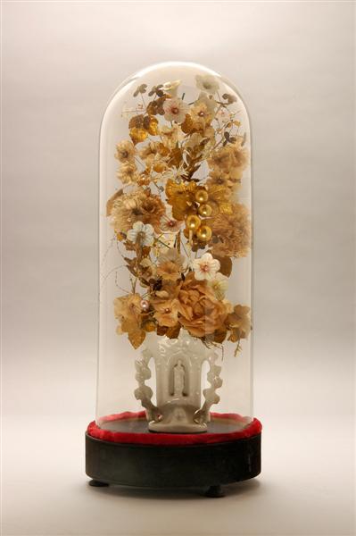 - BeschrijvingIn één van de twee stolpen een wit geglazuurd aardewerken stolpvaasje met nisje, waarin Maria met Kind staat. De tweede stolp heeft een identiek stolpvaasje met nisje, waarin Sint-Jozef staat. In beide vaasjes een boeket bloemen.