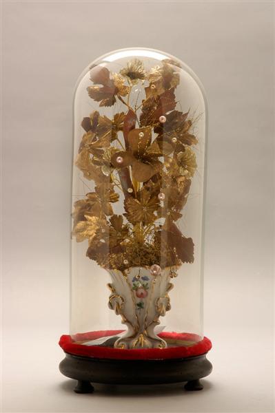 Stolp met wit porseleinen rozenvaasje met bloemen.