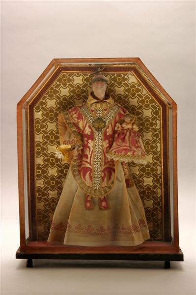 Beeldje van St. Antonius van Padua en kind. De twee bovenste hoeken zijn afgesneden.