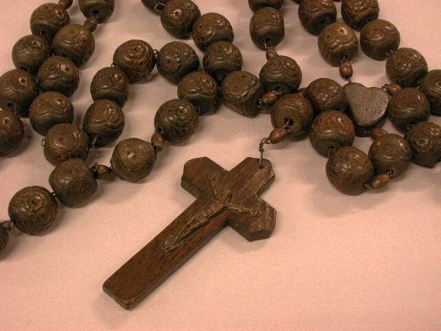 Houten rozenkrans met houten Latijns kruis. Op een onregelmatig gevormd hart het opschrift "SOUVEN.. / de N-D de / LOURDE./ [ster].