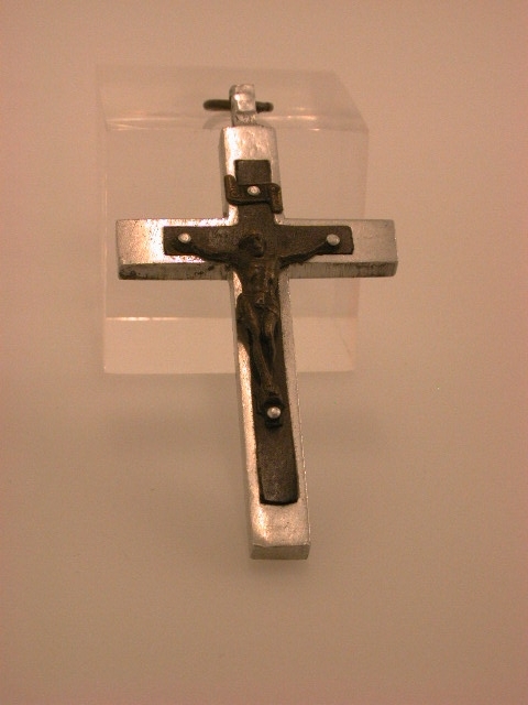 Wit onedel metaal, met een zwart ingelegd kruis met corpus en INRI bordje.