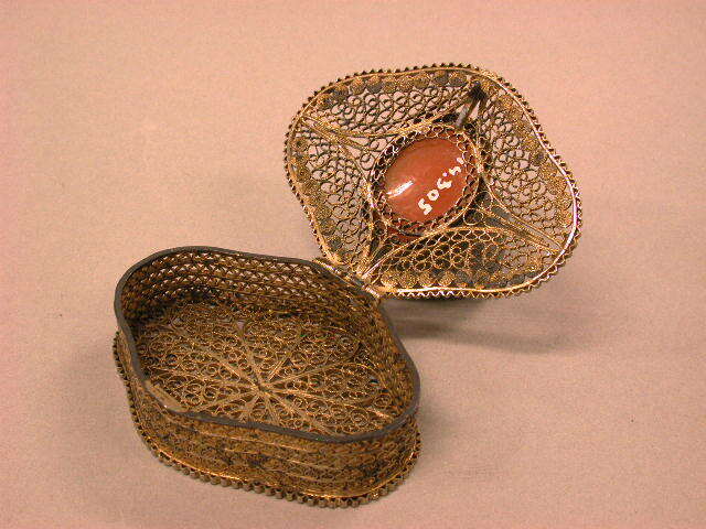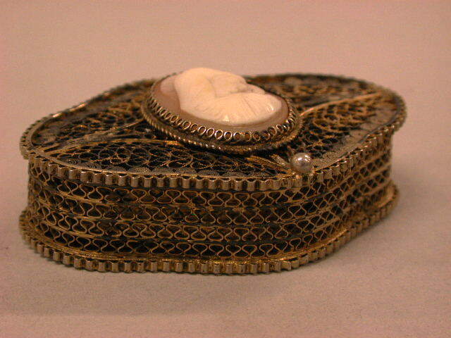 - BeschrijvingHet doosje is afgerond en ruitvormig en afgewerkt met zilver filigrain, verguld met camée (Maria voorstellende) op deksel
