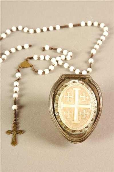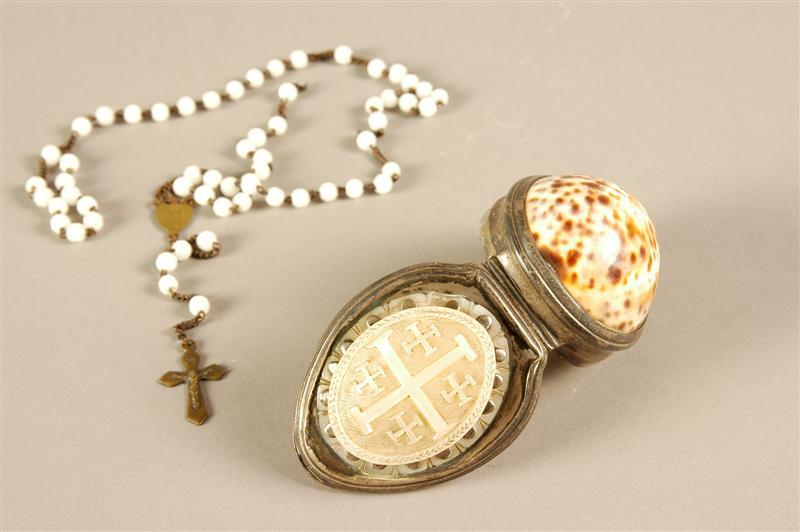 - BeschrijvingOp het deksel staat een Jeruzalemskruis. Het doosje is gemaakt uit een ei-vormige zeeschelp, zwaarverzilverd/zilveren garnituur. Het deksel is versierd met parelmoer.