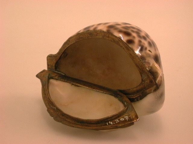 Gemaakt uit wit met donkerbruin gevlekte zeeschelp met koperen garnituur kruis op bovenzijde.