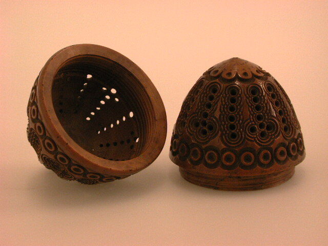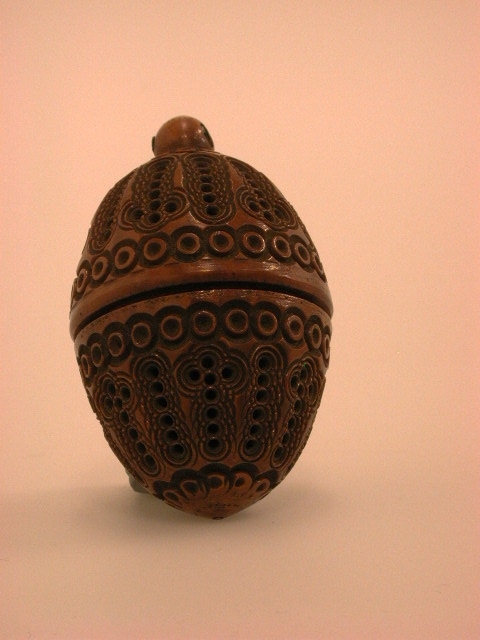 - BeschrijvingEivormig doosje met een ophangoog aan één uiteinde. Versierd met gaatjespatroon van strepen en kruizen.