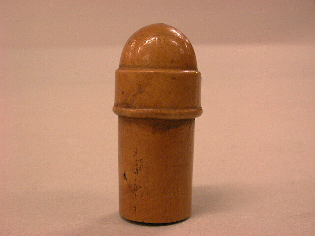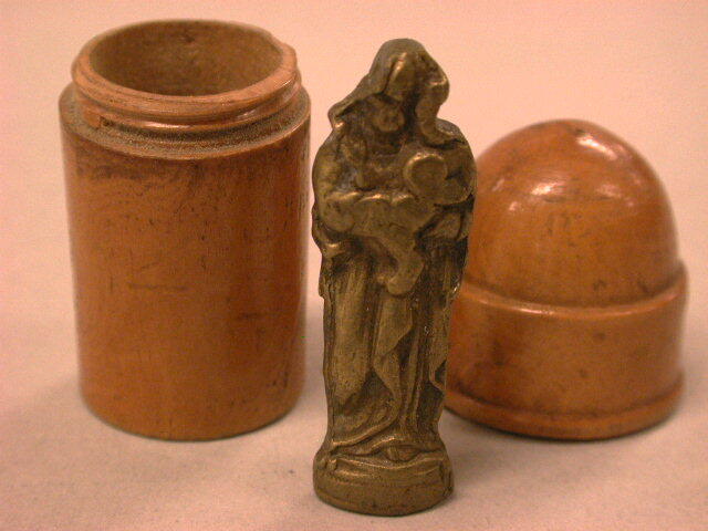Houten cilindervormig doosje of koker, met beeldje van de Heilige Jozef met kind.