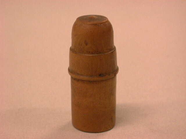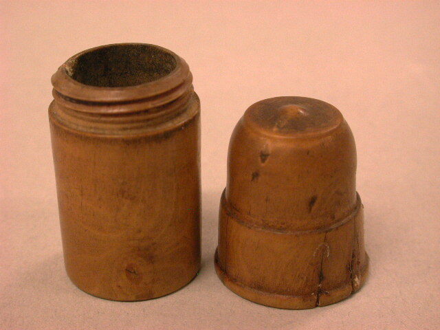 Cilindervormige houten koker met deksel. Bedoeld als koker voor heiligenbeeldje voor op reis.