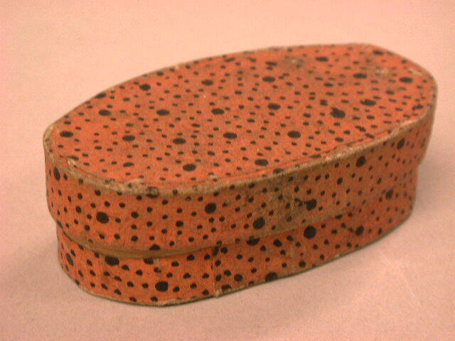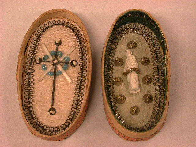 - BeschrijvingSpaanderdoosje, beplakt met oranje papier met zwarte stippen. Gipsen beeldje van Maria en kind, versiering van kralen en zilverdraad aan de binnenzijde.In dekseltje een kruis uit kraaltjes en pailletjes.