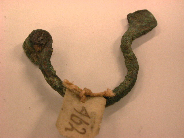 - BeschrijvingDraadfibula met een boog die zonder overgang uitloopt in de voet. Schede is geheel afgebroken. Vermoedelijk heeft de spiraal vier windingen gehad, waarvan de 2 rechterwindingen en de naald ontbreken