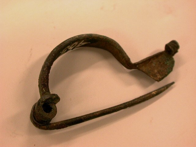 Draadfibula. De platte naar het einde dun uitopende voet gaat haaks op de voet over in een platte boogvormige beugel, waarvan de scherpe kanten enigszins zijn afgerond. De boog gaat over in de spiraaldraad van 4 windingen (vierkante draad) en verder in de ronde naald. Aan de voet is een enigszins cylindervormige 'knop' gemaakt uit een opgerold plat bandje. Op de rug van de boog is een overlangse groef aangebracht met aan beide zijden een puntenlijn. De schede is grotendeels afgebroken