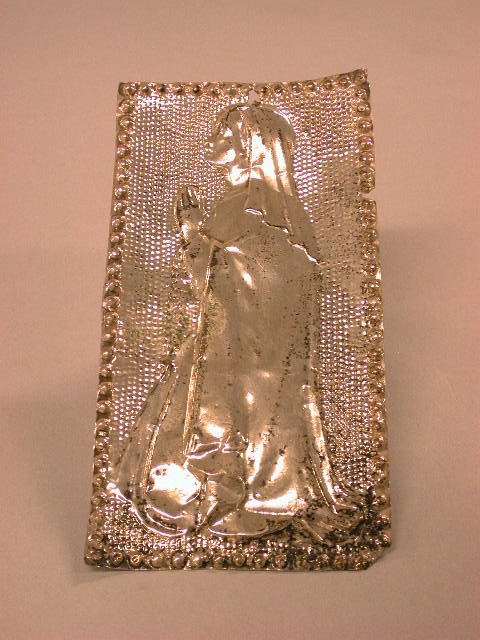 Een rechthoekig zilveren, gedreven votiefbeeld met parelrand.