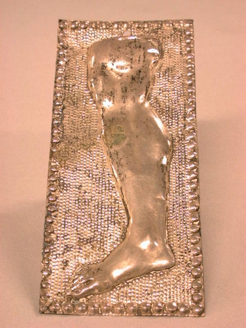 Rechthoekig gedreven zilveren votiefbeeld met de afbeelding van een rechterbeen en een parelrand.
