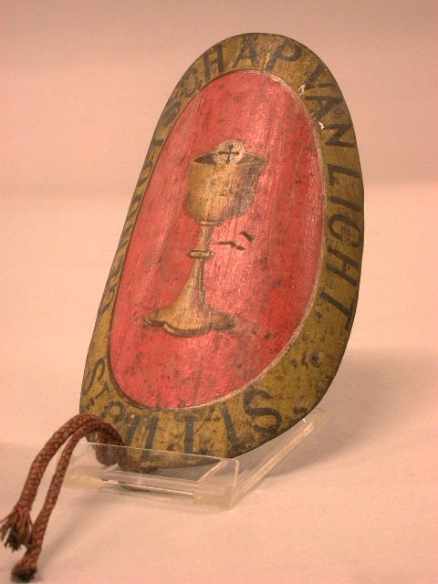 - BeschrijvingSchildje met opschrift Genootschap van Licht, St.-Gillis en afbeelding van miskelk en hostie met Grieks kruis.