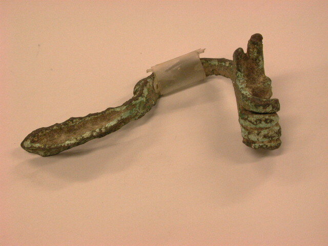 - BeschrijvingBoogfibula knikfibula met tussen de platte voet en de halfronde geschubde beugel een kleine ringversiering. Aan de kop zitten de haak en de 2 steunplaatjes. Van de 8 windingen zijn er vier tegelijk met de naald afgebroken. De hele oppervlakte is nogal geoxydeerd en daardoor ruw en groen uitgeslagen.