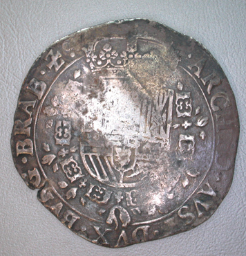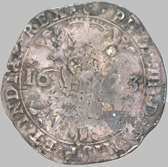 - BeschrijvingVz: Andreaskruis, beladen met kroon, waaronder een guldenvlies hangt. Jaartal 16-23. Daaromheen gerokken parelrand. Kz: Een gekroond wapenschild, omhangen met guldenvlies keten. Uit de vuurslagen van de keten springen vonken. Daaromheen een parelrand (zwaar beschadigd)
