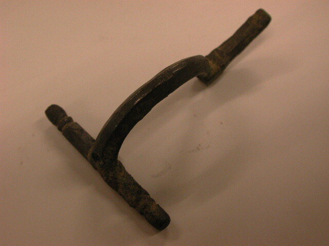- BeschrijvingKruisboogfibula met ronde gladde beugel en gladde zeshoekige dwarsbalk, waarvan aan de uiteinden een groef en een kleine smalle knop. In de beugel bij de kop een gat. Tussen beugel en voet een ingesnoerde hals. Voet geprofileerd.