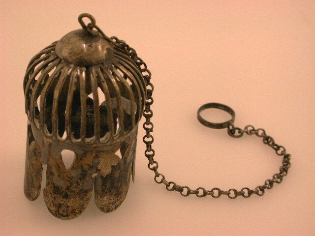 - BeschrijvingMetaal vezilverd kokergedeelte, gelobd en met opengewerkte figuurtjes. Het koepelgedeelte heeft spijltjes en een ringetje met daaraan een ketting.