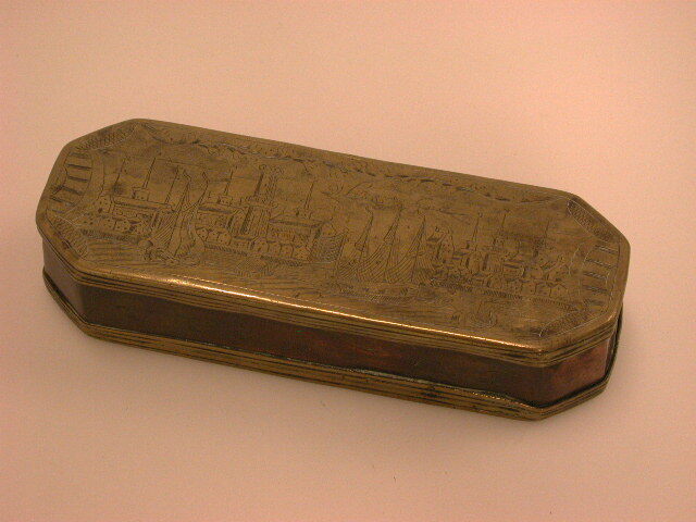 - BeschrijvingTabaksdoos met afgeschuinde hoeken gemaakt van koper. De bodem en het deksel zijn van geelkoper, de wanden van roodkoper. Op het deksel staat een gegraveerde voorstelling van de Vlissingse haven. Op de bodem staat het wapen van Vlissingen.