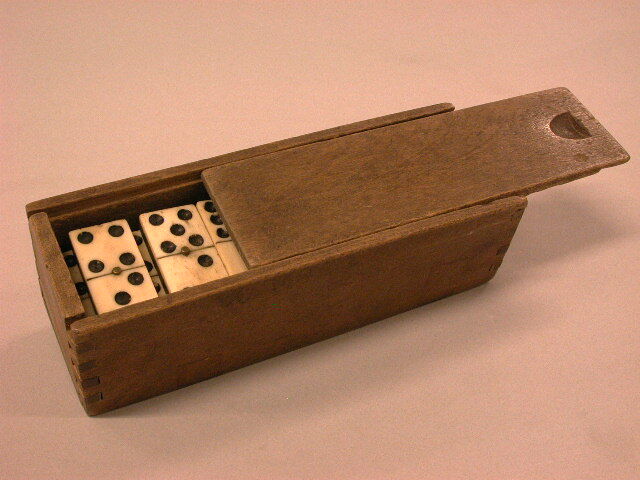 - BeschrijvingHouten doosje met tand- en zwaluwstaartverbindingen. De stenen van been, 27 stuks, zijn met een koperen nageltje op ebbenhout bevestigd.