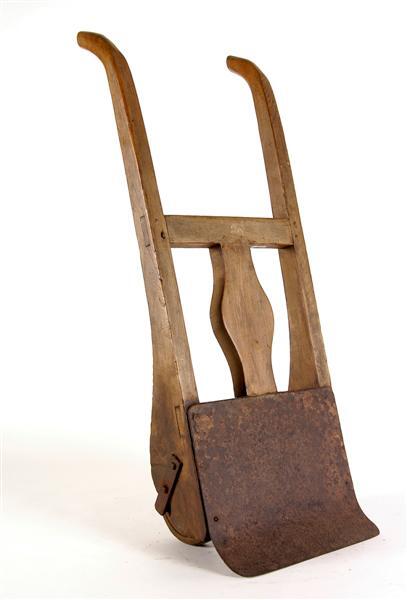 - BeschrijvingHouten frame met gefiguurzaagde middenstuk en houtverbindingen. Gebogen ijzeren plaat als laadplank, ijzeren as met dito wieltjes en rubberen banden.