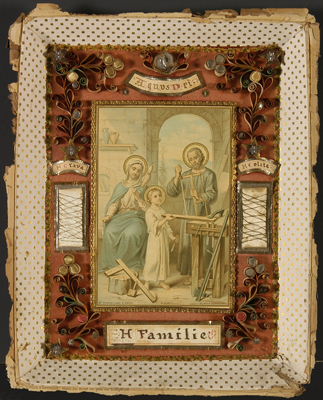 - BeschrijvingDe relikwiehouder bevat relieken van de Heilige Clara en de Heilige Coleta. Beide relieken zijn ter weerszijde van een prent, voorstellende de Heilige Familie, aangebracht.